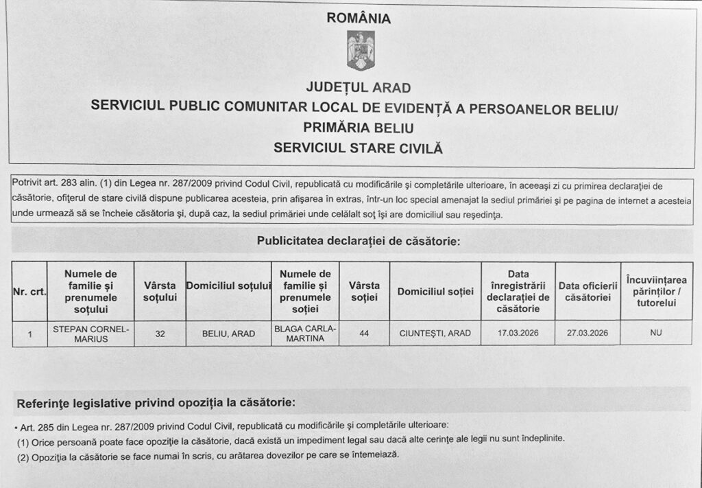 Publicație de căsătorie – STEPAN CORNEL-MARIUS / BLAGA CARLA-MARTINA